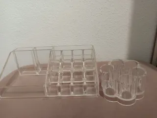 Set de organizadores de maquillaje de acrílico transparente. - Organizador con múltiples compartimentos para labiales y otros productos. - Dispensador redondo con varios huecos.