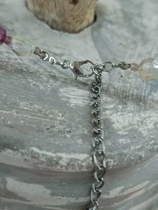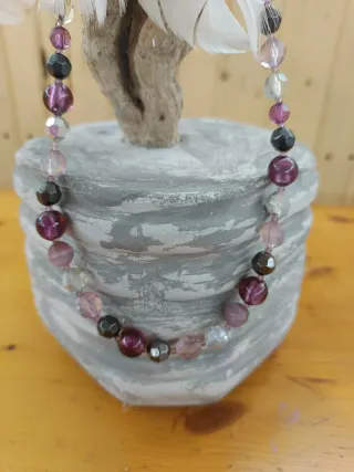 Elegante collar con cuentas de cristal en tonos morados y rosados. - Diseño con cuentas facetadas y lisas. - Combinación de colores vibrantes y sutiles. - Cierre seguro.