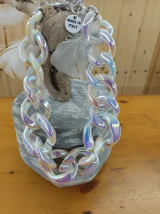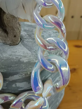 Collar llamativo con eslabones grandes y un acabado iridiscente que cambia de color. - Diseño de eslabones gruesos. - Acabado multicolor con reflejos. - Cierre de cadena.