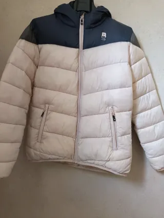 Chaqueta acolchada con diseño moderno. - Paneles en color beige y azul - Capucha integrada. - Cierre de cremallera frontal. - Bolsillos laterales con cremallera.