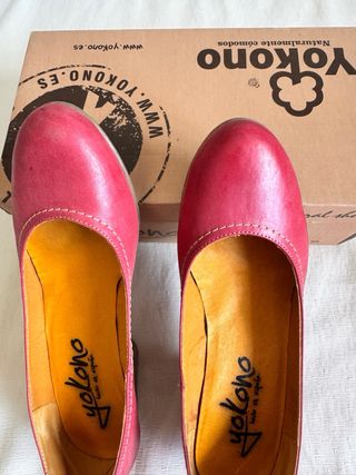 Zapatos de tacón de piel de la marca Yokono en color rosa/rojo. Puestos una sola vez. Muy cómodos. - Tacón con diseño. - Detalle de pespuntes. - Logo de la marca en la plantilla.