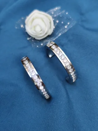 Elegantes pendientes de acero inoxidable con un diseño moderno y brillante. - Detalles de circonitas incrustadas. - Acabado plateado pulido.