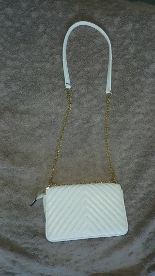 Bolso de hombro con un diseño acolchado en forma de espiga. El logo de la marca resalta en la parte frontal. - Asa de cadena dorada. - Correa de hombro blanca.