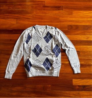 Jersey de manga larga con un diseño de rombos en gris y azul marino. El cuello es en pico y el tejido es ligero. - Diseño de rombos. - Cuello en pico. - Manga larga.
