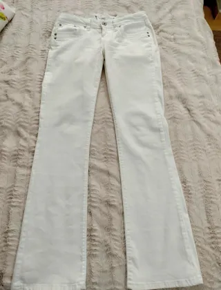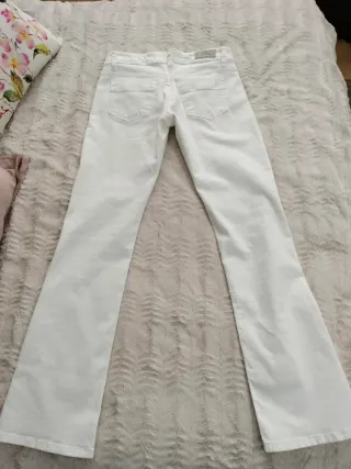 Vaqueros de corte bootcut en color blanco. Un básico versátil para cualquier armario. - Corte bootcut. - Diseño de cinco bolsillos. - Cierre de cremallera y botón. - Llevan un añadido elástico en la parte trasera de la cintura para ir más cómoda (foto). - Me los he puesto una vez porque se me han quedado justos. - Medidas en fotos. - Envío sólo con inPost.