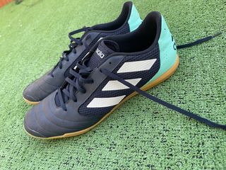 Zapatillas deportivas Adidas para fútbol sala. - Diseño en color azul marino con detalles en turquesa. - Tres franjas blancas laterales. - Suela de goma para mayor agarre.