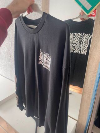 Sudadera negra de Zara con un diseño gráfico llamativo en la parte frontal y detalles en las mangas. - Diseño gráfico abstracto en blanco y rosa. - Detalle de diseño en las mangas. - Cuello redondo.
