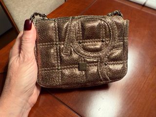 Bolso de mano con un diseño acolchado y detalles metálicos envejecido. - Acabado texturizado en tonos marrones y dorados. - Cierre de solapa con detalle de anilla. - Costuras decorativas. - Tachuelas metálicas.