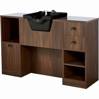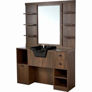 Tocador de barbería con lavacabezas integrado. Un mueble funcional y elegante para tu espacio. - Diseño con acabado en madera oscura. - Amplio espejo central. - Múltiples estantes para almacenamiento. - Compartimentos laterales y cajones.