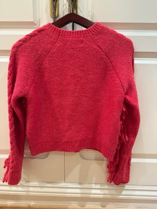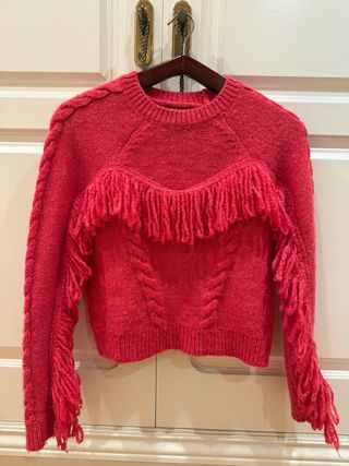 Jersey de punto de la marca Only en color rojo. Presenta un diseño moderno con flecos decorativos en el pecho y las mangas. - Manga larga. - Cuello redondo. - Detalle de trenzas en las mangas y el cuerpo.