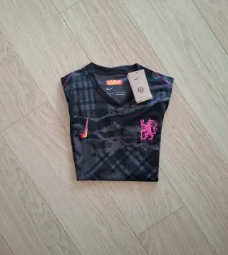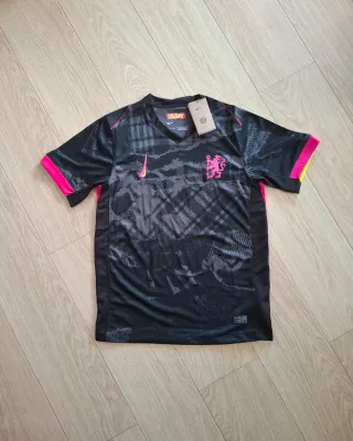 Camiseta de fútbol del Chelsea Football Club, nueva y con etiquetas. - Diseño moderno con detalles en rosa y amarillo. - Logo de Nike bordado. - Escudo del club bordado en el pecho.