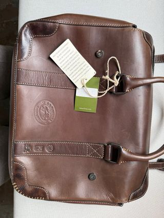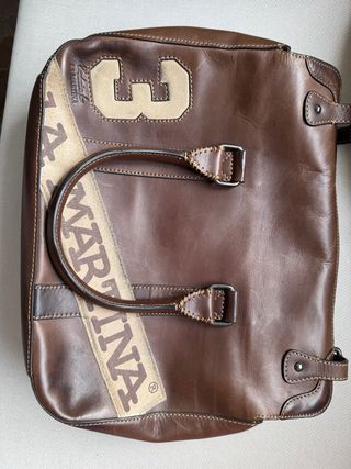 Maletín de piel en color marrón con detalles distintivos. - Diseño con número 3 y logo de la marca. - Tira de tela con el nombre La Martina. - Asas de piel con costuras reforzadas. - Cierre con hebilla metálica.