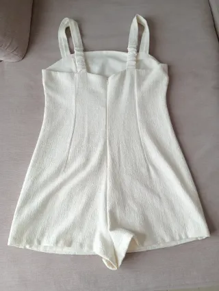 Mono - vestido - pantalón corto, blanco con tirantes anchos y escote cuadrado. Su tejido texturizado le da un toque especial. Talla L pero es como una M - Tejido texturizado.