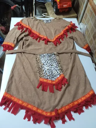 Disfraz(vestido) de india con detalles de flecos de color rojo y naranja. - Delantal marrón con estampado de animal y flecos de colores rojos y naranjas. -Polainas marrones con estampado superior de animal y flecos rojos . Además trae cinta roja para atar alrededor de la pierna. - Tira de plumas de colores para la cabeza.