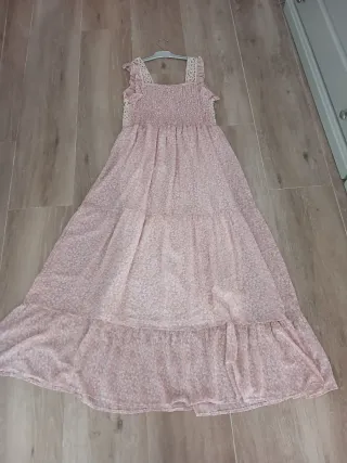 Vestido largo con un diseño delicado y femenino. La parte superior es de crochet y la falda es de volantes. - Parte superior de crochet. - Falda larga con volantes en capas. - Estampado floral sutil.
