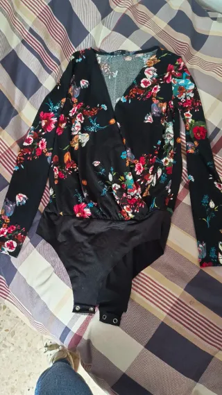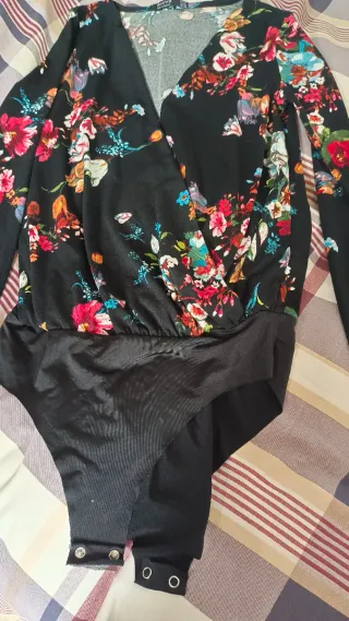 Body de manga larga con estampado floral sobre fondo negro. - Diseño cruzado en el escote. - Cierre de corchetes en la parte inferior.