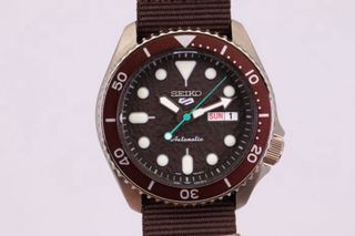 Reloj Seiko 5 Sports SRPD85K1 con movimiento automático. Un accesorio elegante y funcional. - Caja de acero inoxidable. - Correa de tela marrón. - Bisel giratorio unidireccional. Seiko 5 Sports SRPD85K1 reloj automático para hombre papeles originales incluidos nuevo!