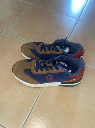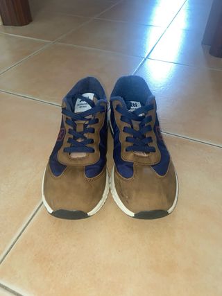 Zapatillas de vestir para niño con un diseño moderno y cómodo. - Combinación de colores azul y marrón. - Cierre con cordones. - Detalle de logo en el lateral.