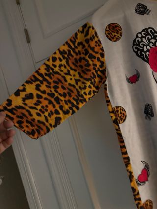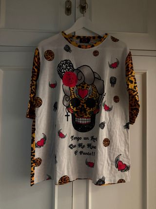 Camiseta con un diseño llamativo y original. - Estampado frontal de calavera con flor y detalles. - Mangas con estampado de leopardo. - Frase Tengo un Art Que Me Mue & Punto!! en la parte delantera. - Pequeños corazones alados y círculos con estampado de leopardo distribuidos por la prenda.