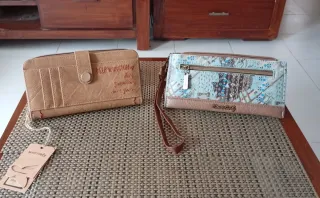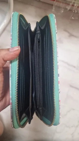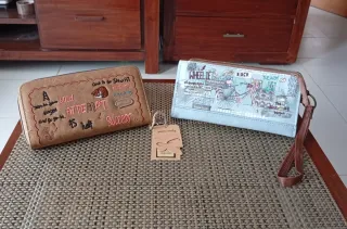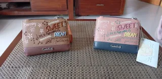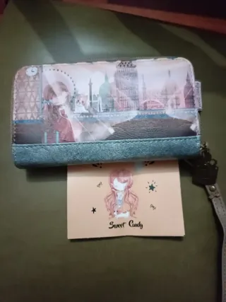 Carteras con bonitos estampados. Muy completas con monedero en la parte interior y un bolsillo con cremallera exterior. Medidas: 12,5cm largo x 10cm alto. Marca: Sweet candy. Precio de cada una. Nuevo con caja.