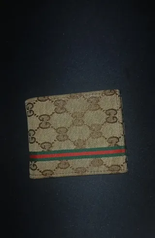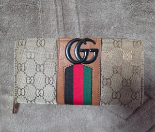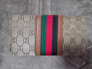 Cartera de la marca Gucci con un diseño clásico. - Estampado GG. - Raya verde y roja. - Material de lona.
