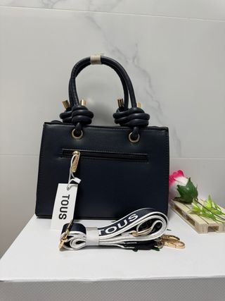 Elegante bolso negro de la marca Tous. Color azul✨ - Diseño con el logo de la marca en relieve. - Incluye un adorable charm de oso. - Correa de hombro con el nombre de la marca. - Asas superiores con detalle de nudos.