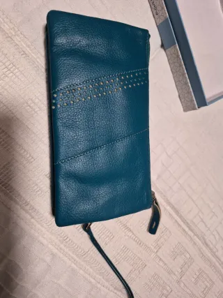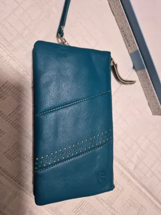 Elegante cartera de piel con un diseño moderno y detalles únicos. - Material: Piel genuina. - Color: Turquesa. - Diseño con costuras y tachuelas decorativas. - Incluye correa de mano. Pregunta lo que necesites y ven a verla sin compromiso.