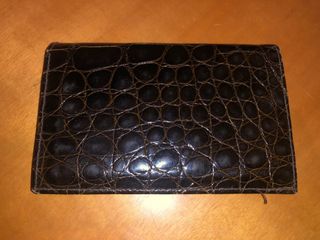 Elegante cartera de piel con un distintivo acabado que imita la textura de cocodrilo. - Material: Piel genuina. - Diseño: Efecto cocodrilo texturizado. - Color: Tonos oscuros de marrón. - Espacio para monedas con cierre. Y espacio para targetas. - Muy poco uso
