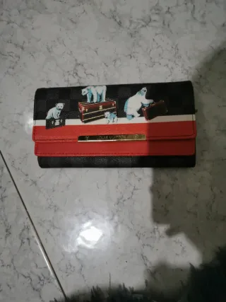 Cartera Louis Vuitton con un diseño único de osos polares y maletas. - Estampado de osos polares y maletas. - Detalles en rojo y negro.