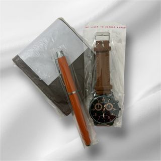 Conjunto de cartera, bolígrafo y reloj - Cartera de color marrón. - Bolígrafo de color naranja. - Reloj con correa marrón y esfera oscura. Ideal para regalo o uso diario. Se entrega tal como se ve en la foto.