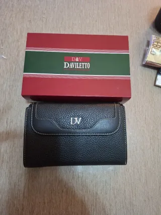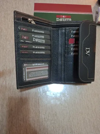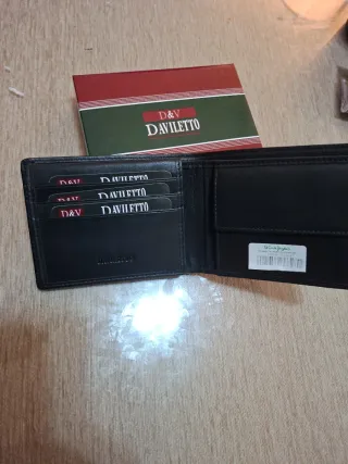 Elegante cartera billetera de la marca Daviletto. - Diseño clásico y funcional. - Acabado en piel negra. - Pequeño detalle metálico con logo en la parte frontal.