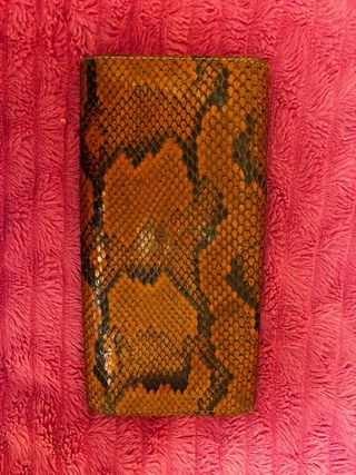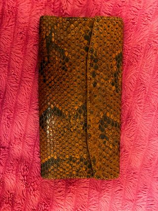 Elegante cartera grande con un diseño de piel de serpiente. - Material: Piel de serpiente. - Color: Marrón y multicolor.