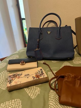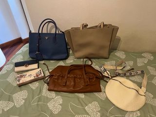 Conjunto de cinco bolsos de diferentes estilos y colores. - Bolso tote grande en color beige. - Bolso Azul. - Cartera azul marino con detalles en marrón. - Bolso marrón con cordones. - Bolso blanco con estampado. - Cartera de mano con detalles florales.