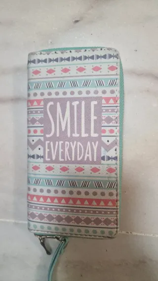 Cartera con un diseño tribal moderno y alegre, perfecta para llevar tus esenciales. - Frase Smile Everyday en el centro. - Patrones geométricos en tonos morados, turquesas y rosas. - Cierre de cremallera. - Incluye una pulsera para llevarla cómodamente.