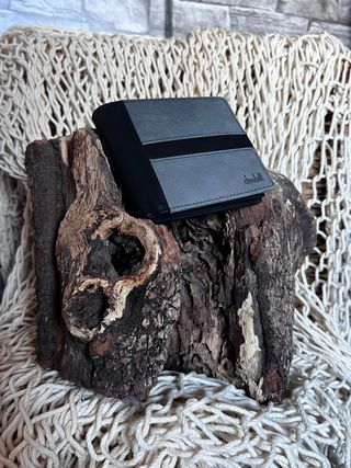 Cartera de hombre con un diseño moderno y elegante. - Combinación de materiales en gris y negro. - Detalles de costura visibles.