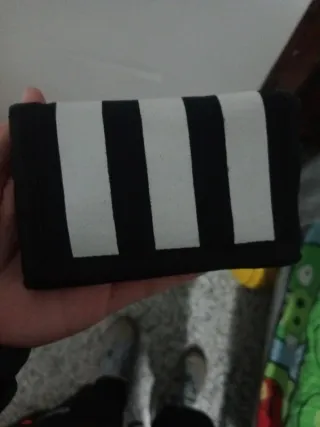 Cartera de la marca Adidas con un diseño de rayas verticales. - Diseño de rayas blancas sobre fondo negro. - Cierre de velcro.