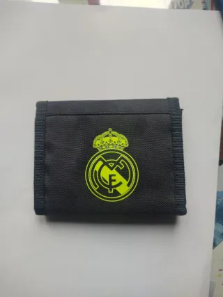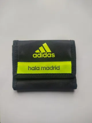 Cartera de la marca Adidas con el escudo del Real Madrid. - Diseño en color negro y detalles en verde neón. - Inscripción Hala Madrid en la parte frontal.