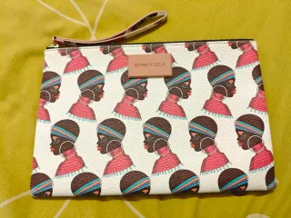 Bolso cartera con un diseño llamativo. - Estampado de figuras femeninas. - Detalles en tonos rojos, azules y naranjas. - Cierre de cremallera.