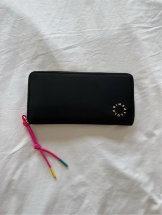 Cartera billetera de la marca Bimba y Lola. - Diseño en piel texturizada. - Cierre de cremallera. - Logo de la marca grabado. Cartera billetero de Bimba y Lola. Apenas usada. Tiene un pequeño rayon de boli. Por lo demás está perfecta.Color negro y cinta de la cremallera en rosa