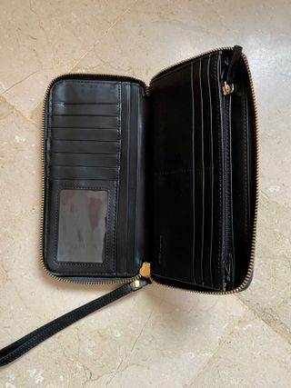 Tarjetero-monedero de piel en color rojo. Modelo con cierre de cremallera dorada y asa de tejido logotipada. Exterior con logo de la marca estampado. La vendo porque no me cabe la documentación que llevo a diario