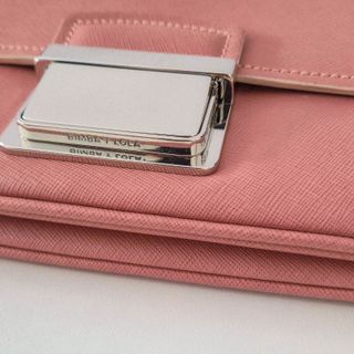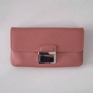 Bolso mini / cartera de mano de Bimba y Lola en color rosa pastel (tono empolvado). * Viene con una correa desmontable. Puedes llevarlo colgado al hombro o quitarle la correa para usarlo como bolso de mano (clutch) o cartera. * Textura efecto Saffiano con cierre de hebilla metálica en plateado. * Cuenta con un bolsillo con cremallera y el logo. Está limpio y listo para usar. Muy buen estado. La estructura se mantiene perfecta y las esquinas están bien. Muestra signos de uso muy leves, pero en general se ve estupendo.