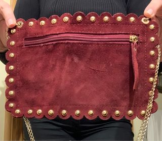 Elegante cartera de ante con un diseño festoneado y adornos dorados. - Material: Ante - Color: Burdeos - Adornos: Tachuelas doradas - Cadena: Metálica dorada - Cierre: Cremallera