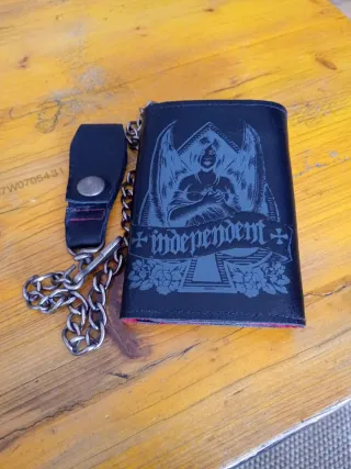 Cartera de cuero del grupo Metallica con cadena con mosquetón y enganche para cinturón, y llavero a juego. Sin estrenar.