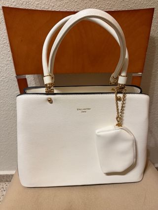 Elegante bolso de mano en color blanco, con un diseño moderno y sofisticado. Incluye una pequeña cartera a juego. - Detalle de cadena dorada. - Cierre de cremallera en la cartera.