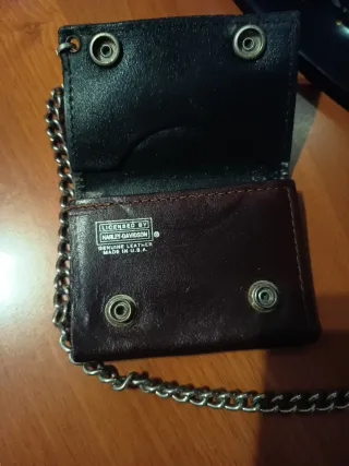Cartera de cuero con el logo de Harley Davidson y cadena. - Diseño en relieve del águila y el logo de la marca. - Cierre con broches metálicos. - Cadena metálica resistente.