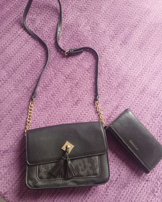 Conjunto de bolso de mano y cartera. - Bolso con correa de cadena dorada. - Adorno de flecos y detalle metálico. - Cartera a juego.