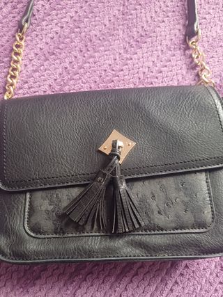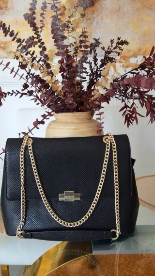 Elegante bolso de piel con detalle de cadena dorada. - Material: polipiel texturizada. - Color: Negro. - Adorno: Cadena metálica dorada. Tiene desgastes por uso, se ce en las fotos. Cabe dentro movil, cartera, y alguna cosa mas.