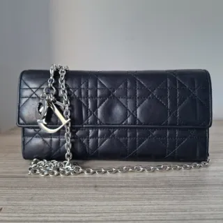 •Precioso bolso cartera Lady Dior Diorama de gran tamaño con cadena plateada extraible, decorada con el caracteristico acolchado Cannage de la marca y una solapa externa. La cartera incluye el charm con letras plateadas de Dior en un lateral.El interior consta de 6 tarjeteros , varios compartimentos para billetes y un compartimento interno con cremallera.Su grandes medidas permiten guardar un telefono tipo samsuns s 22 o Iphone 13 mas en su interior y ademas de todos sus elementos esenciales. •Medidas:20 cm ancho x 10,5 cm alto x 4 cm profundidad. El articulo se encuentra en muy buen estado con leves signos de uso