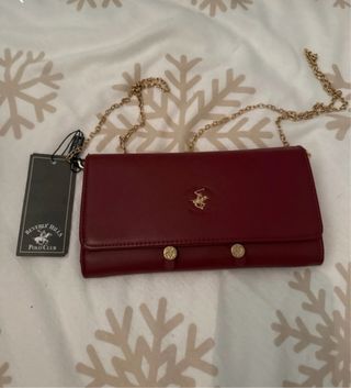 Elegante cartera de la marca Beverly Hills Polo Club, con su etiqueta original. - Diseño en color rojo. - Cadena dorada para llevar al hombro o cruzada. - Cierre con botones dorados.