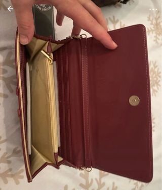 Elegante cartera de piel en burdeos - Logo metálico de la marca. - Cremallera dorada. - Detalle de cadena dorada.